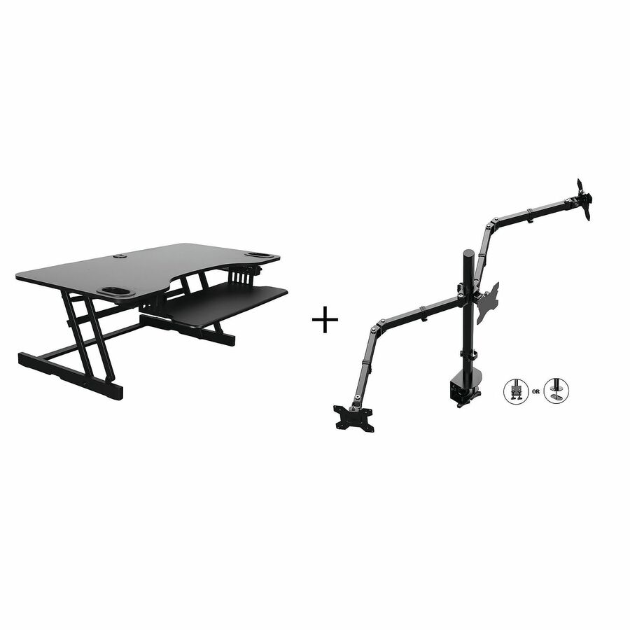 The Rocelco R ADRB-45-DM3 Standing Desk Converter Bundle is the perfect way to get your ergonomic workstation started. It comes with a Sit-to-Stand Desk Riser and a Triple Monitor Mount. The Standing Desk Converter provides the proven health benefits of sitting/standing. The sturdy steel frame with easy-grip side handles and pneumatic gas-piston assist allows you to raise up to 40lb on the large desk riser top, measuring 45" x 22.6" , between 4.7" and 17.5" above your existing tabletop. Dual-piston lift system provides smoother height adjustment. This desk offers a large retractable keyboard tray, measuring 28.7" x 9.6" , that slides in, pulls out and locks into place for easier access to entire desk riser top. The workstation can hold up to three monitors up top and a laptop on the keyboard tray, or a large monitor and a laptop on top with keyboard on the sliding tray. This bundle comes with anti-scratch foam rubber pads to protect your work surface. Use the convenient grommet hole to route cables and install the included triple monitor arm. Securely attach your dual screens, up to 27"/17.6 lb. each. Monitor arms tilt + or - 45 degrees, swivel 180 degrees and rotate 360 degrees. Monitors can be mounted in horizontal or vertical position. Arms adjust in height along the pole for ideal ergonomic position. Cable management clips come included. Easily adjust height up to 17.75" and extension from pole to monitor up to 26".